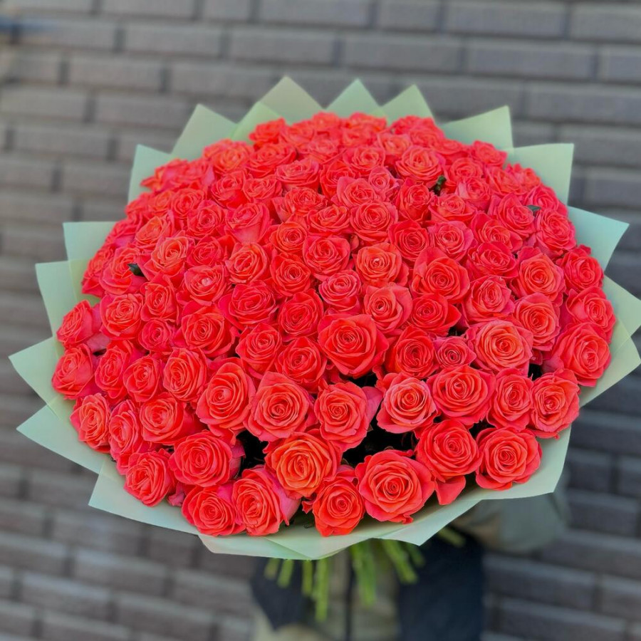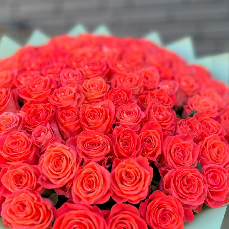 На фото букет из 101 коралловой розы. В составе: роза 101 шт, дизайнерская упаковка 2 шт, атласная лента 1 шт, . Все цветы свежие и ароматные, букет красиво оформлен и отлично подходит для подарка. Доступна доставка цветов или самовывоз.