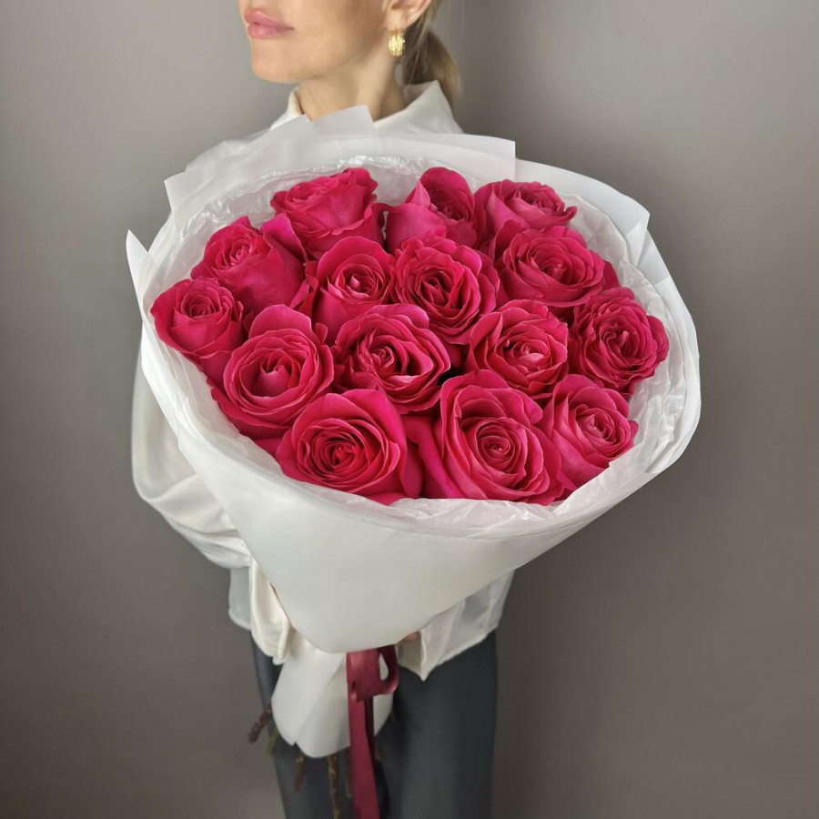 На фото букет из 15 малиновых роз. В составе: роза 15 шт, дизайнерская упаковка 1 шт, атласная лента 1 шт, . Все цветы свежие и ароматные, букет красиво оформлен и отлично подходит для подарка. Доступна доставка цветов или самовывоз.