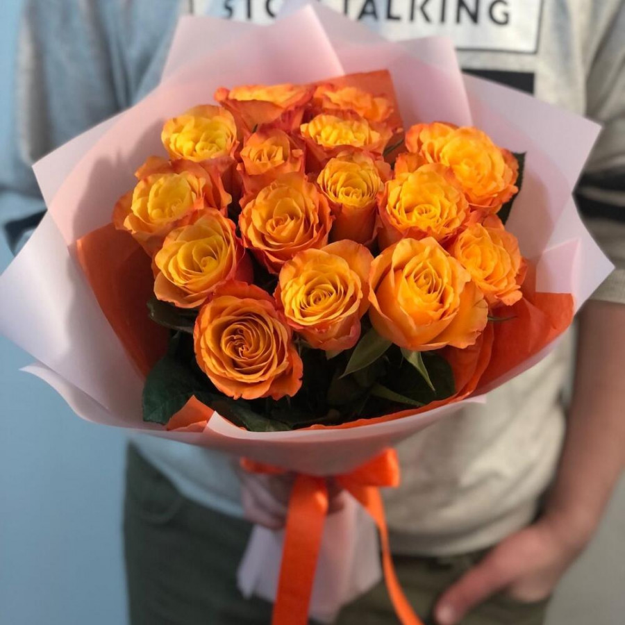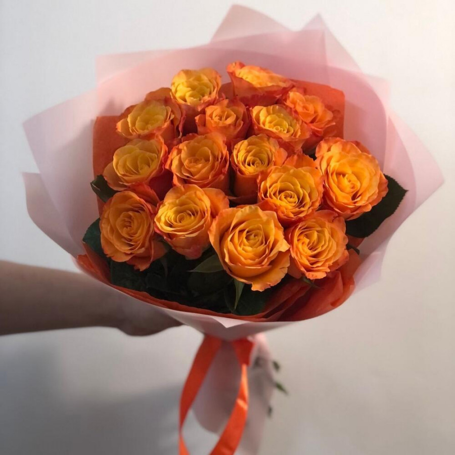 На фото 15 оранжевых роз. В составе: роза 15 шт, дизайнерская упаковка 2 шт, атласная лента 2 шт, . Все цветы свежие и ароматные, букет красиво оформлен и отлично подходит для подарка. Доступна доставка цветов или самовывоз.