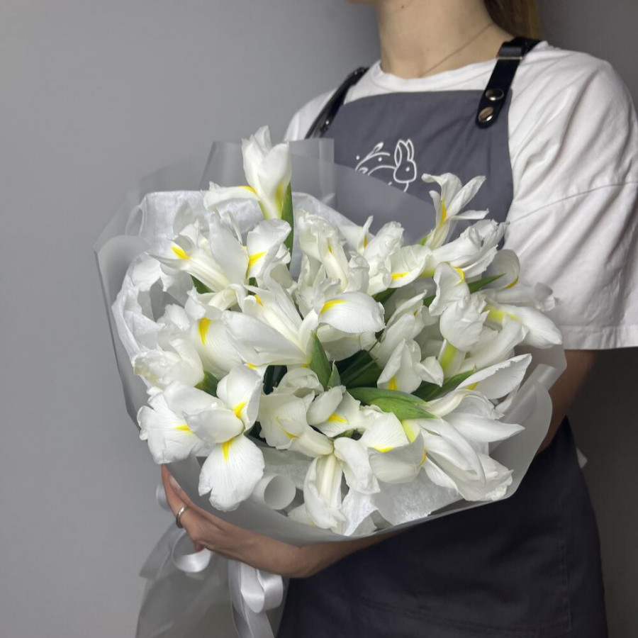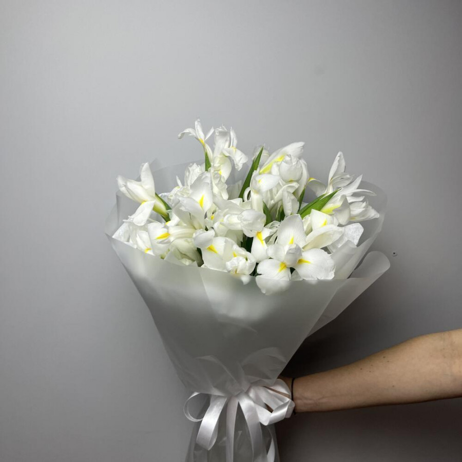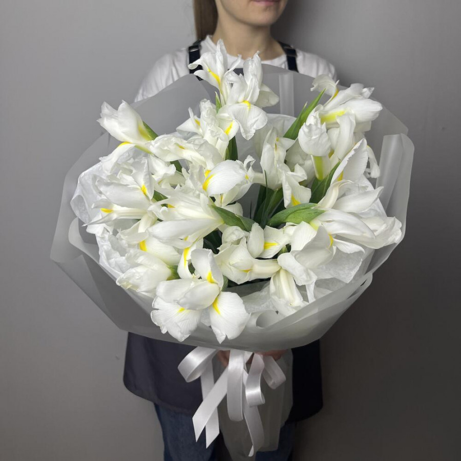 На фото букет 25 белых ирисов. В составе: ирис 25 шт, дизайнерская упаковка 1 шт, атласная лента 1 шт, . Все цветы свежие и ароматные, букет красиво оформлен и отлично подходит для подарка. Доступна доставка цветов или самовывоз.