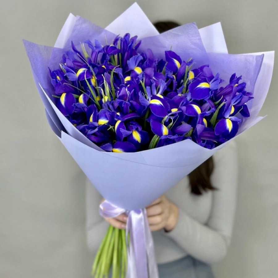 На фото букет из 51 синего ириса. В составе: ирис 51 шт, дизайнерская упаковка 2 шт, атласная лента 2 шт, . Все цветы свежие и ароматные, букет красиво оформлен и отлично подходит для подарка. Доступна доставка цветов или самовывоз.