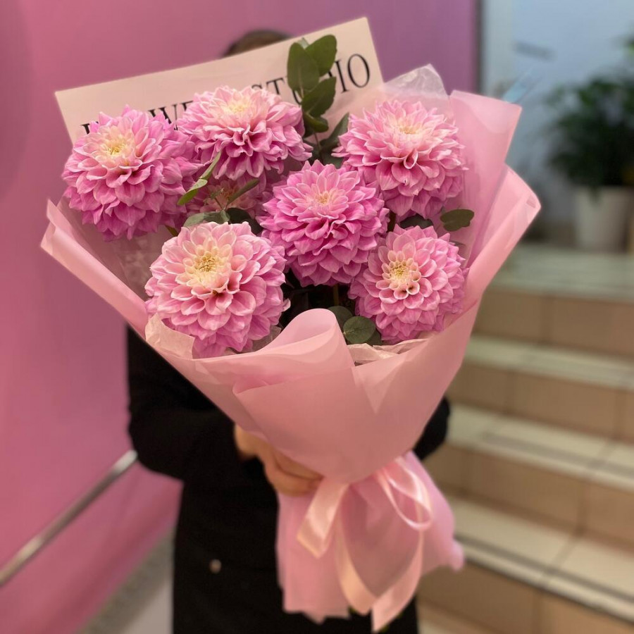 На фото букет из 7 розовых георгин. В составе: георгина 7 шт, эвкалипт 3 шт, дизайнерская упаковка 1 шт, атласная лента 1 шт, . Все цветы свежие и ароматные, букет красиво оформлен и отлично подходит для подарка. Доступна доставка цветов или самовывоз.