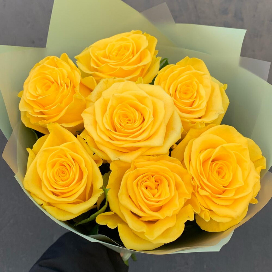 На фото букет из 7 желтых роз. В составе: роза 7 шт, дизайнерская упаковка 1 шт, атласная лента 1 шт, . Все цветы свежие и ароматные, букет красиво оформлен и отлично подходит для подарка. Доступна доставка цветов или самовывоз.
