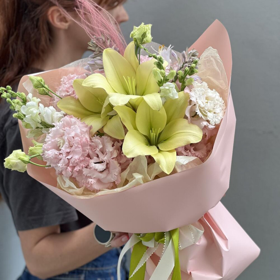 На фото букет «хрустальный луг». В составе: лилия 3 шт, эустома (лизиантус) 4 шт, зелень 3 шт, дизайнерская упаковка 1 шт, атласная лента 1 шт, . Все цветы свежие и ароматные, букет красиво оформлен и отлично подходит для подарка. Доступна доставка цветов или самовывоз.
