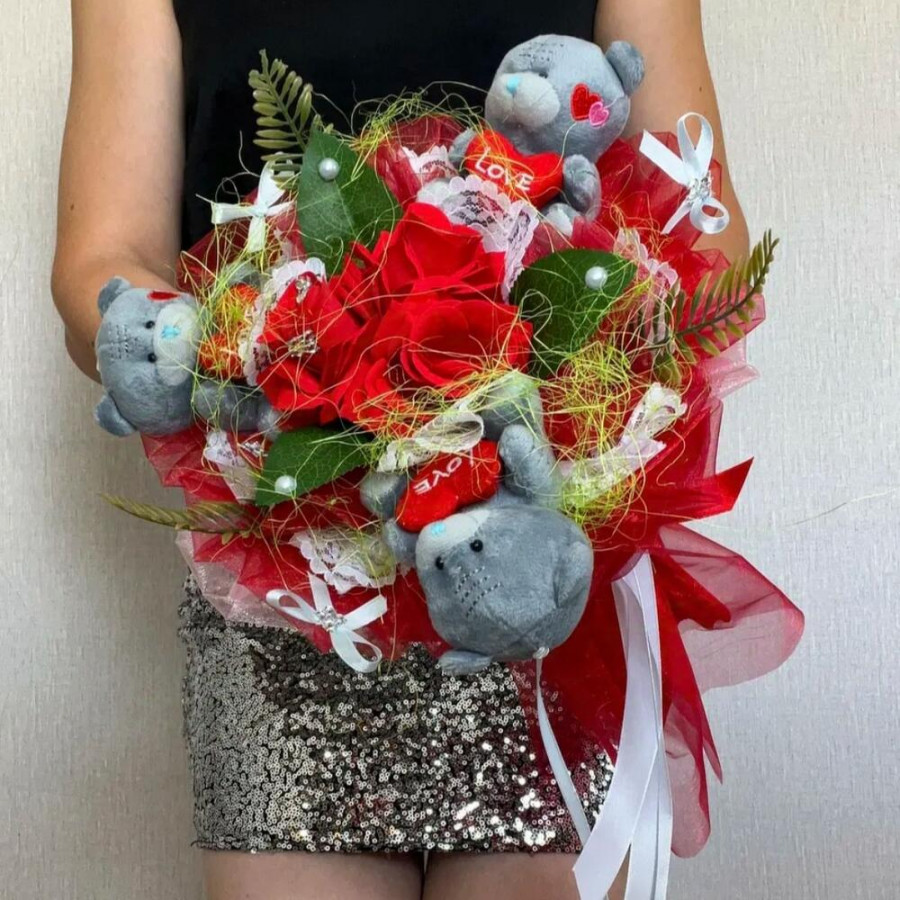 На фото букет из мягких игрушек 3 мишек тедди. В составе: . Все цветы свежие и ароматные, букет красиво оформлен и отлично подходит для подарка. Доступна доставка цветов или самовывоз.