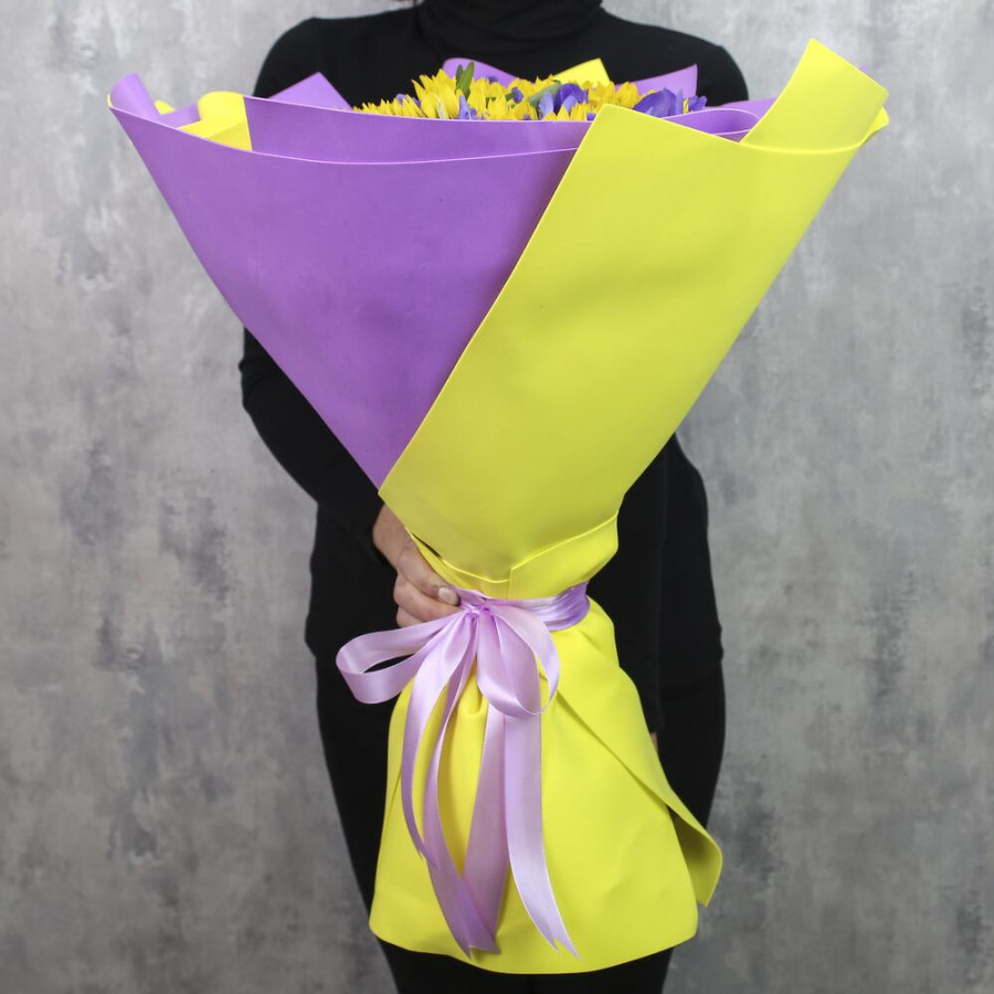 На фото букет из подсолнухов и ирисов. В составе: подсолнух 21 шт, ирис 8 шт, писташ 2 шт, дизайнерская упаковка 1 шт, атласная лента 1 шт, . Все цветы свежие и ароматные, букет красиво оформлен и отлично подходит для подарка. Доступна доставка цветов или самовывоз.