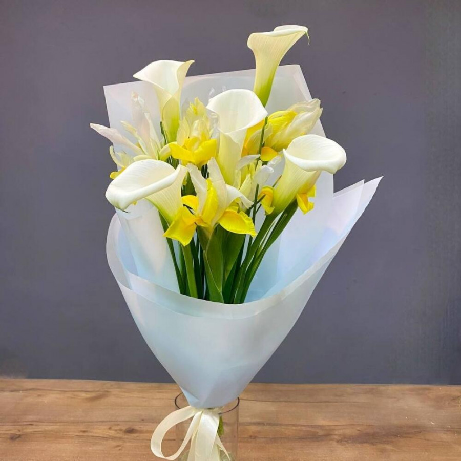 На фото букет из желтых ирисов и беллых калл. В составе: ирис 9 шт, калла 5 шт, дизайнерская упаковка 1 шт, атласная лента 1 шт, . Все цветы свежие и ароматные, букет красиво оформлен и отлично подходит для подарка. Доступна доставка цветов или самовывоз.