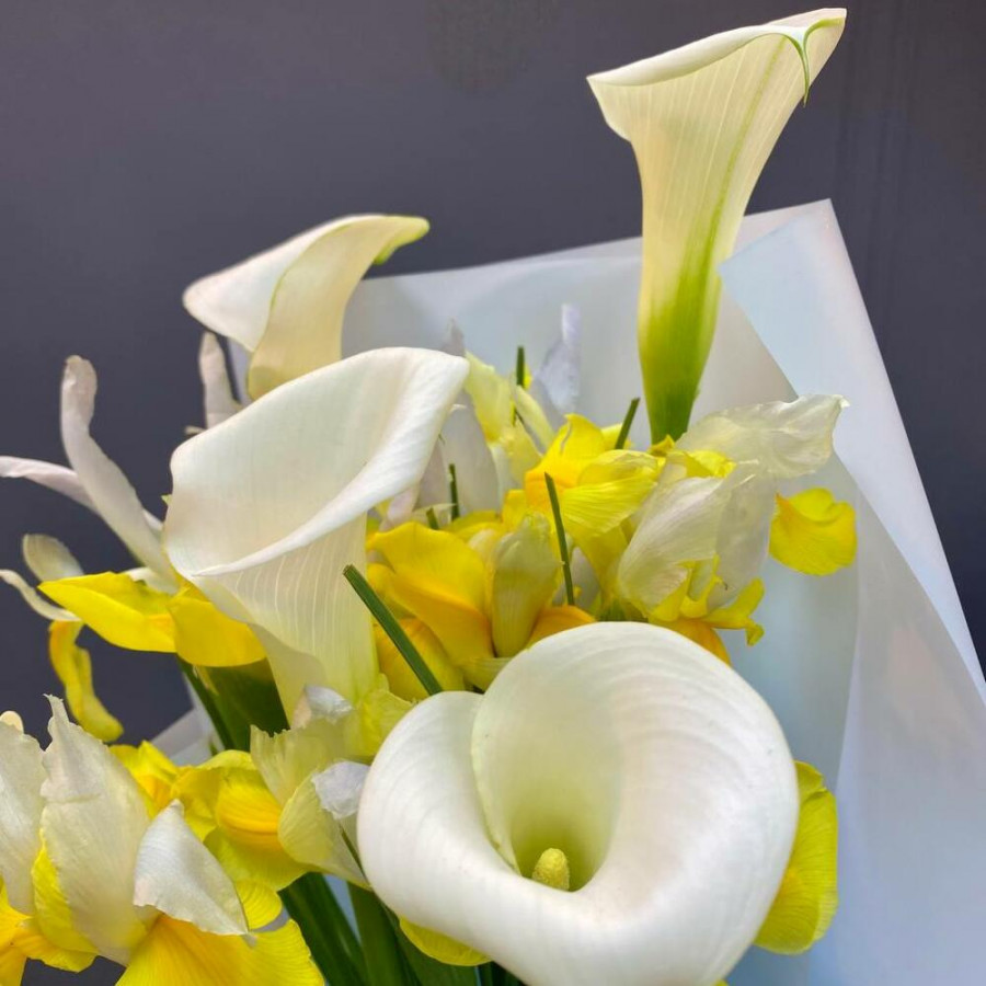 Букет из желтых ирисов и беллых калл