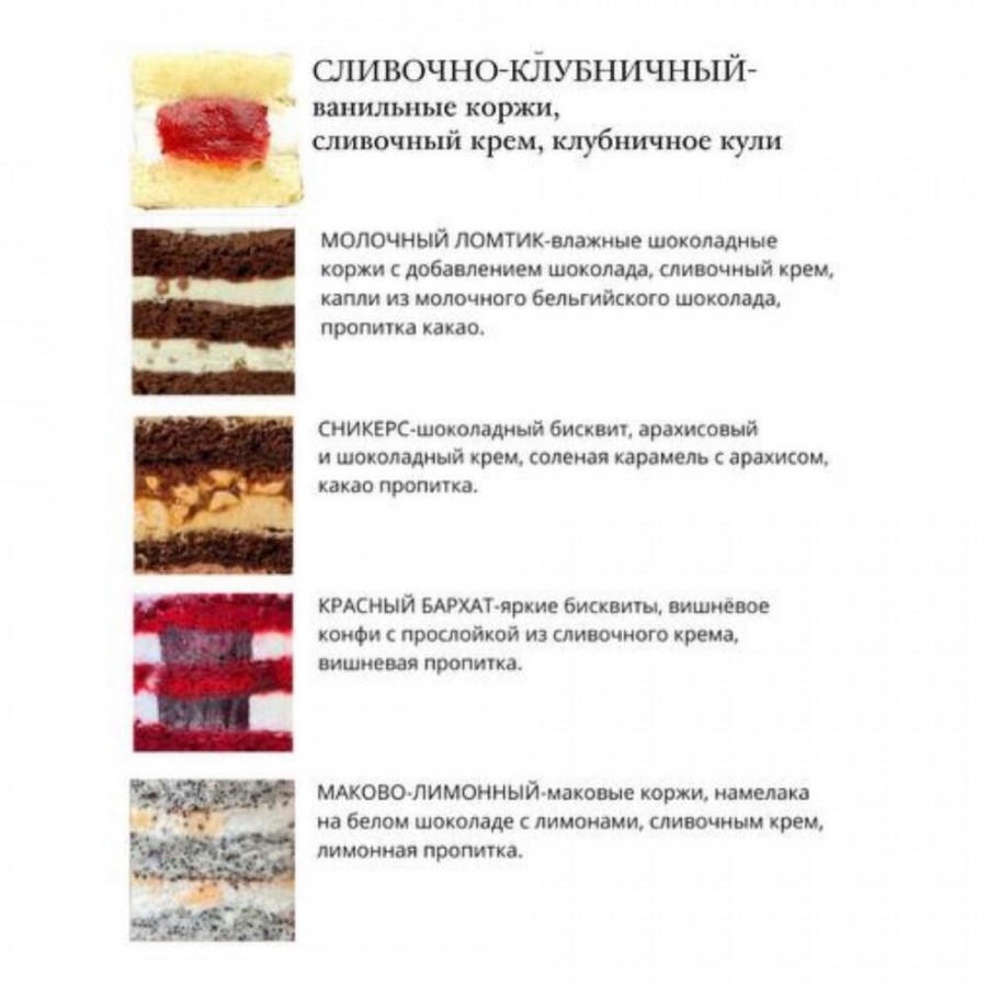 Сливочное масло 82,2% , мука, яйца, сливки 33%, белый шоколад, натуральный краситель, сахар, экстракт ванили Возможны следы сои и Орехов